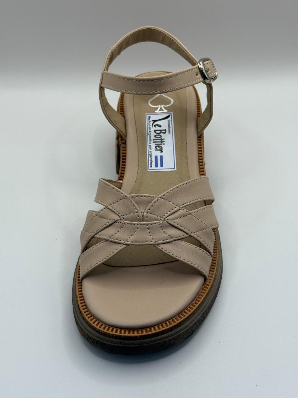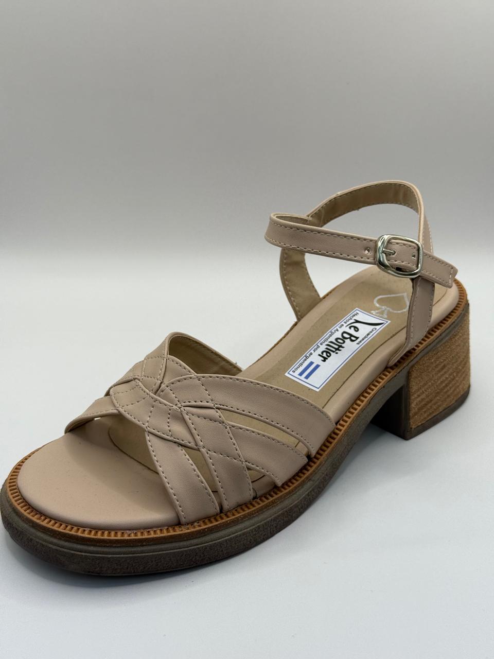Su capellada destaca por un sofisticado diseño de tiras finas entrelazadas (estilo huarache) que se adaptan con suavidad al pie. El confort está asegurado gracias a su taco bloque de altura media, con un elegante acabado símil madera, que te brinda estabilidad y altura sin esfuerzo.